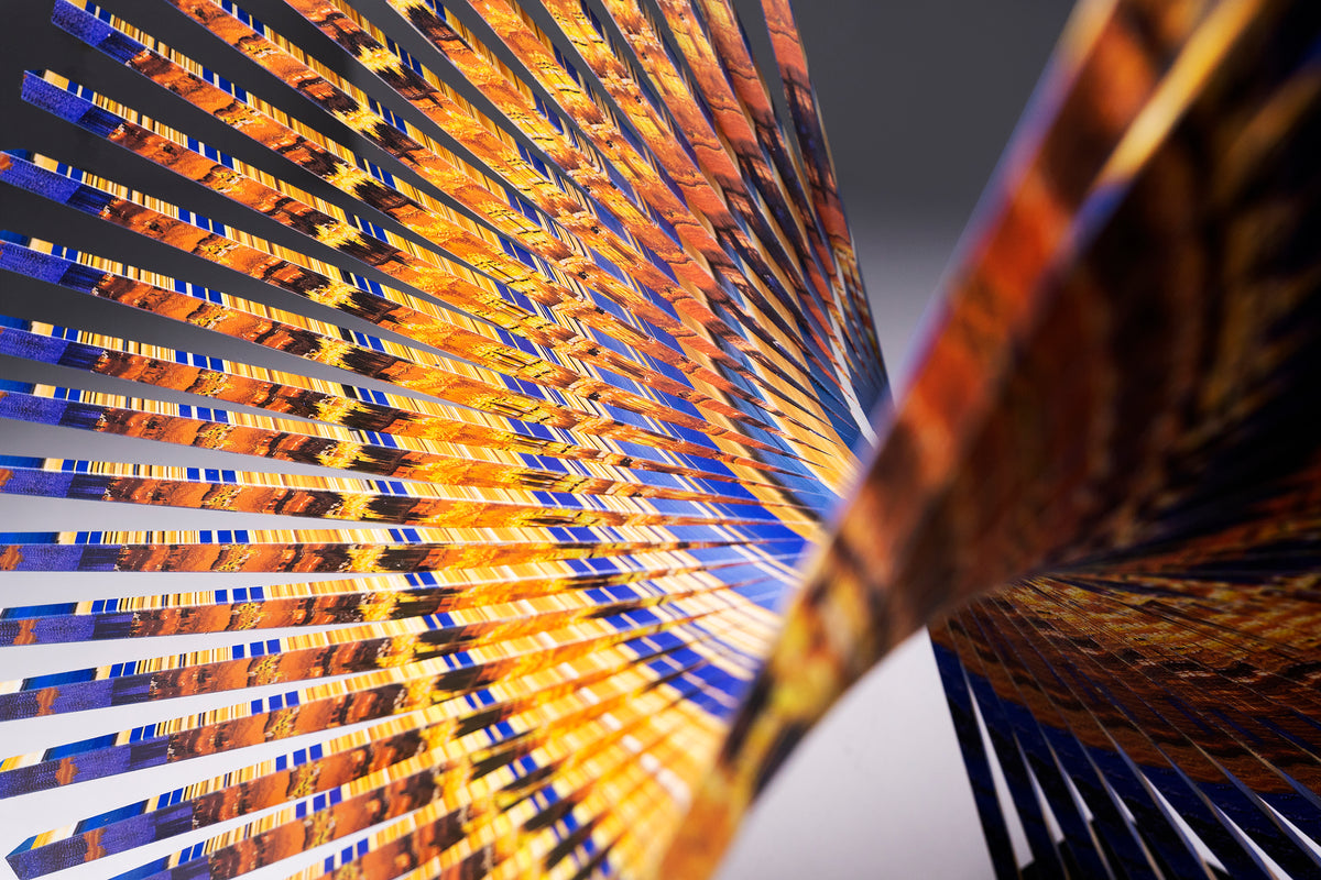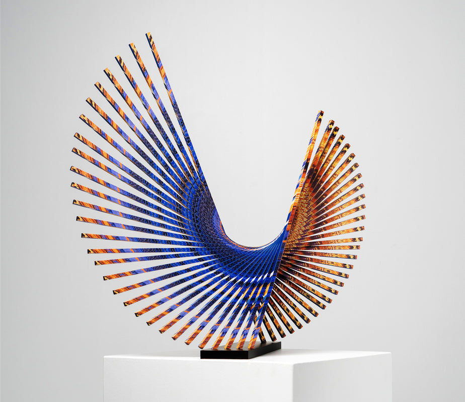 ‘Blue Phoenix’ is a sculpture comprising interlocked aluminium parts coated with adigitally-printed pattern fixed to a discrete base.